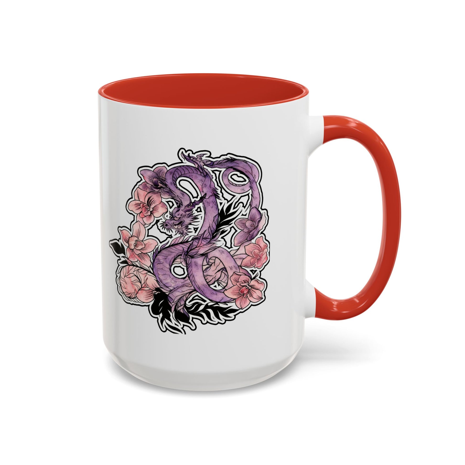 Elevate your coffee or tea ritual with this accented ceramic mug featuring original tattoo artwork of a Dragon surrounded by Orchids. The sleek glossy finish and eye-catching color contrast make this mug a bliss to use and look at. Perfect for coffee lovers and tattoo enthusiasts, this mug is suitable for everyday use or as a thoughtful gift for special occasions.