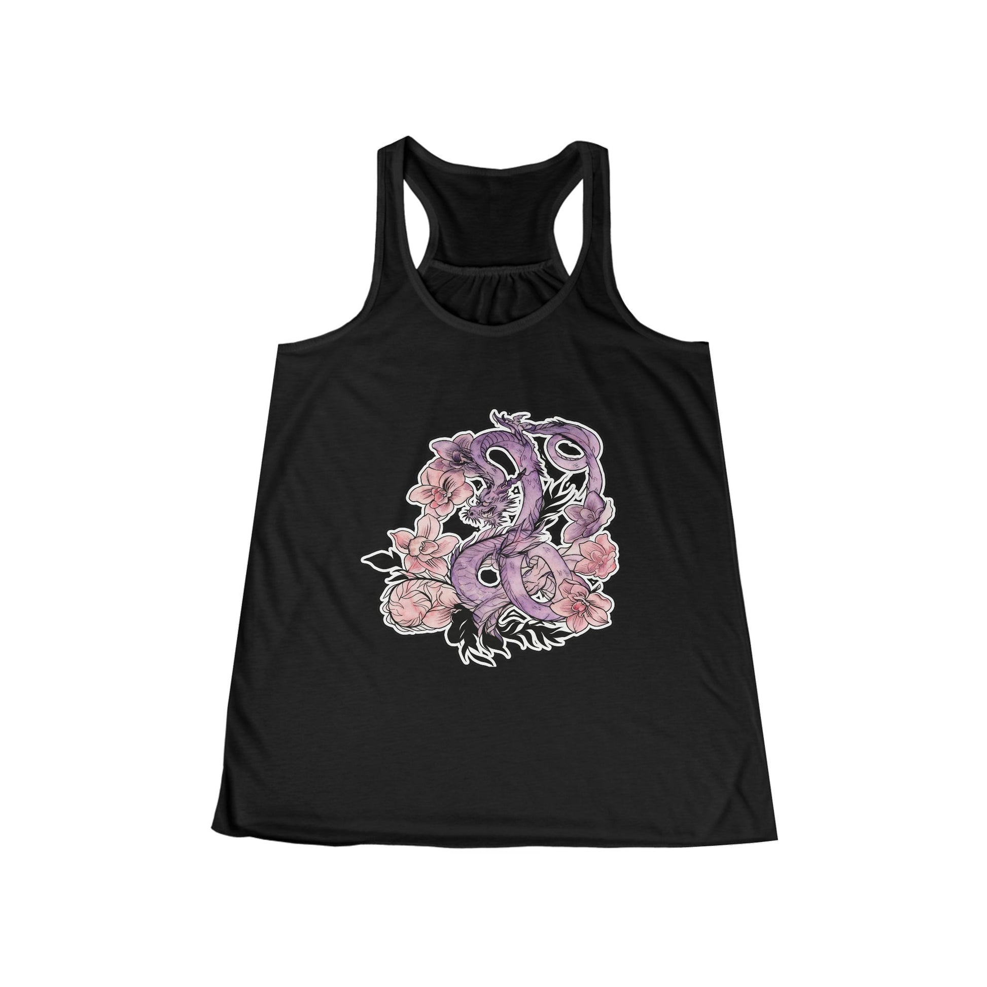 This flowy racerback tank blends bold tattoo-inspired art with delicate floral charm. A purple dragon weaves through pink orchids across the soft, draping fabric — a striking contrast of fierce and feminine. Lightweight and relaxed, the tank moves with you: layered over a bralette for warm evenings or worn solo when the heat rises. The racerback silhouette reveals shoulders and lets the design take center stage, while the subtle overlock detailing and self-fabric binding give a handcrafted touch. For those who love statement art and easywear comfort, this tank brings a little edge to everyday moments — beach strolls, music nights, or wandering through summer markets.