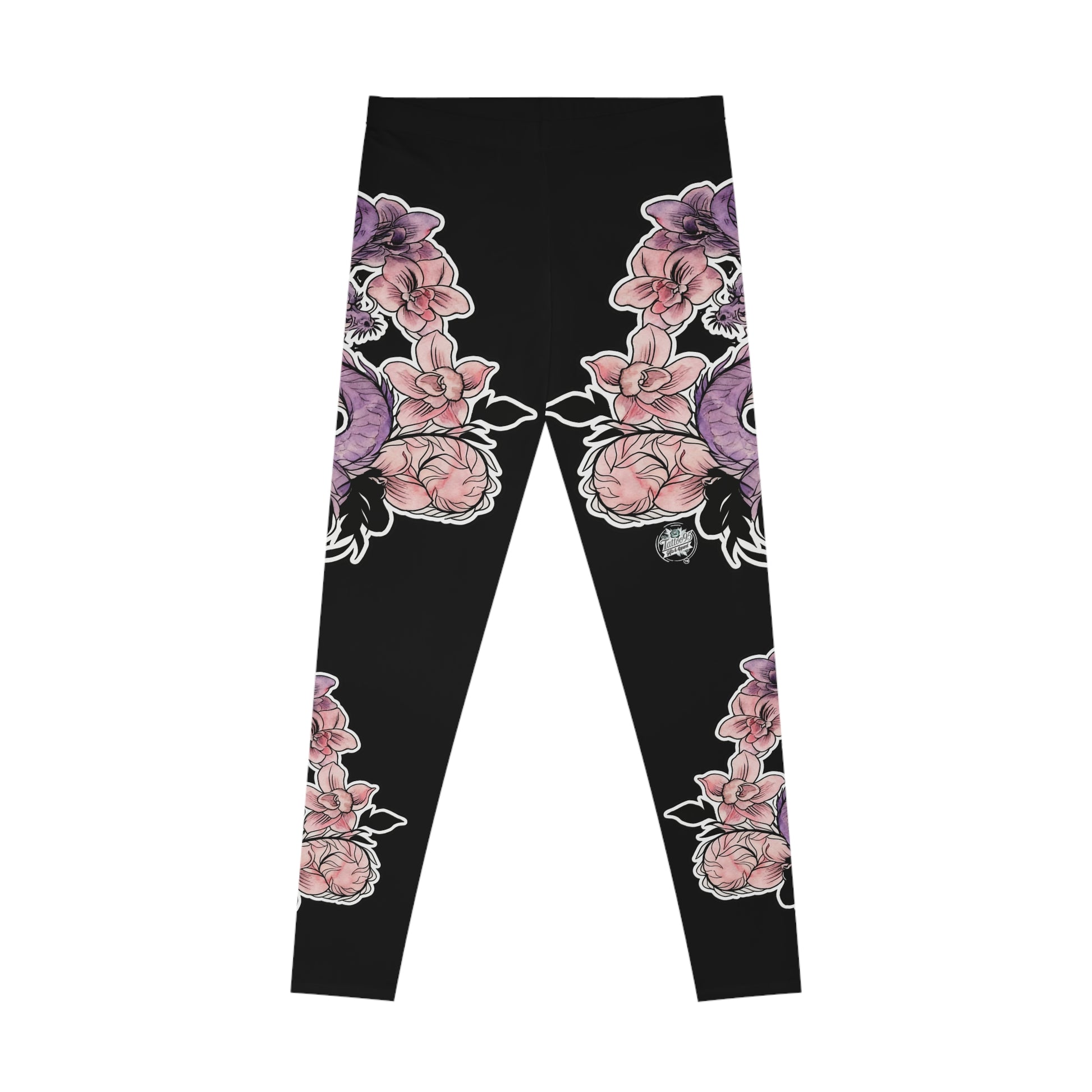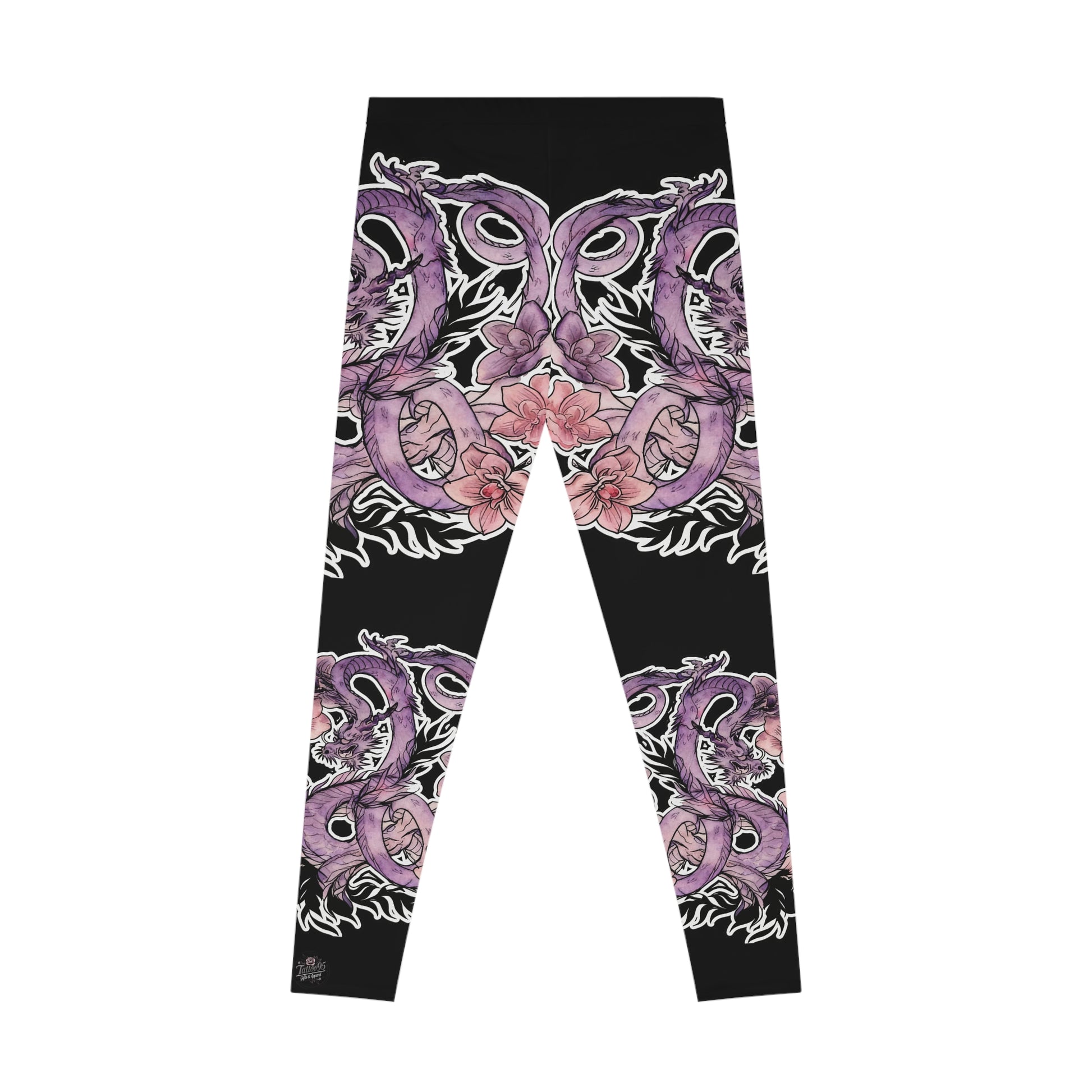 These personalized leggings featuring light purple dragon and pink orchids tattoo design are perfect for yoga sessions, running errands, or casual outings. Made with a stretchy fabric for a silhouette-complimenting fit, these ankle-length leggings with a mid-waist fit are assembled in the USA for quality control. Ideal for those looking for unique and stylish activewear.