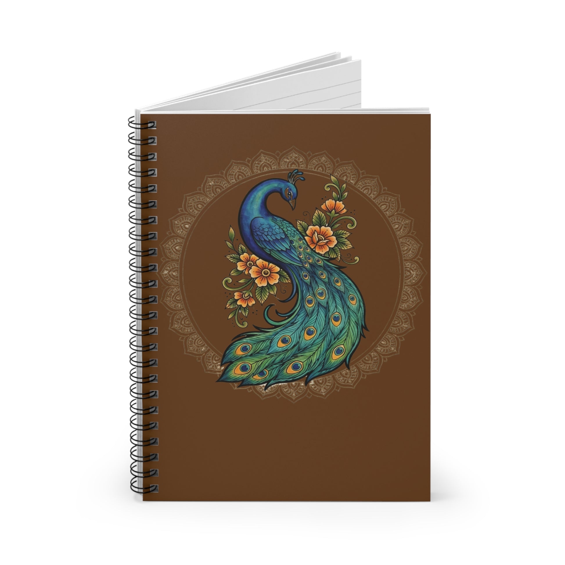 This ruled spiral notebook brings a touch of vintage elegance to everyday writing. The front features a richly colored peacock illustration framed by a subtle mandala, set against a warm brown background that feels cozy and timeless. Inside, smooth 90gsm lined pages glide beneath your pen—great for journaling, lists, class notes, or sketching ideas. A metal spiral lay-flat binding and an inner document pocket keep pages accessible and loose notes safe. At 6" x 8", it slips into bags easily and sits comfortably on a desk or lap when inspiration strikes.