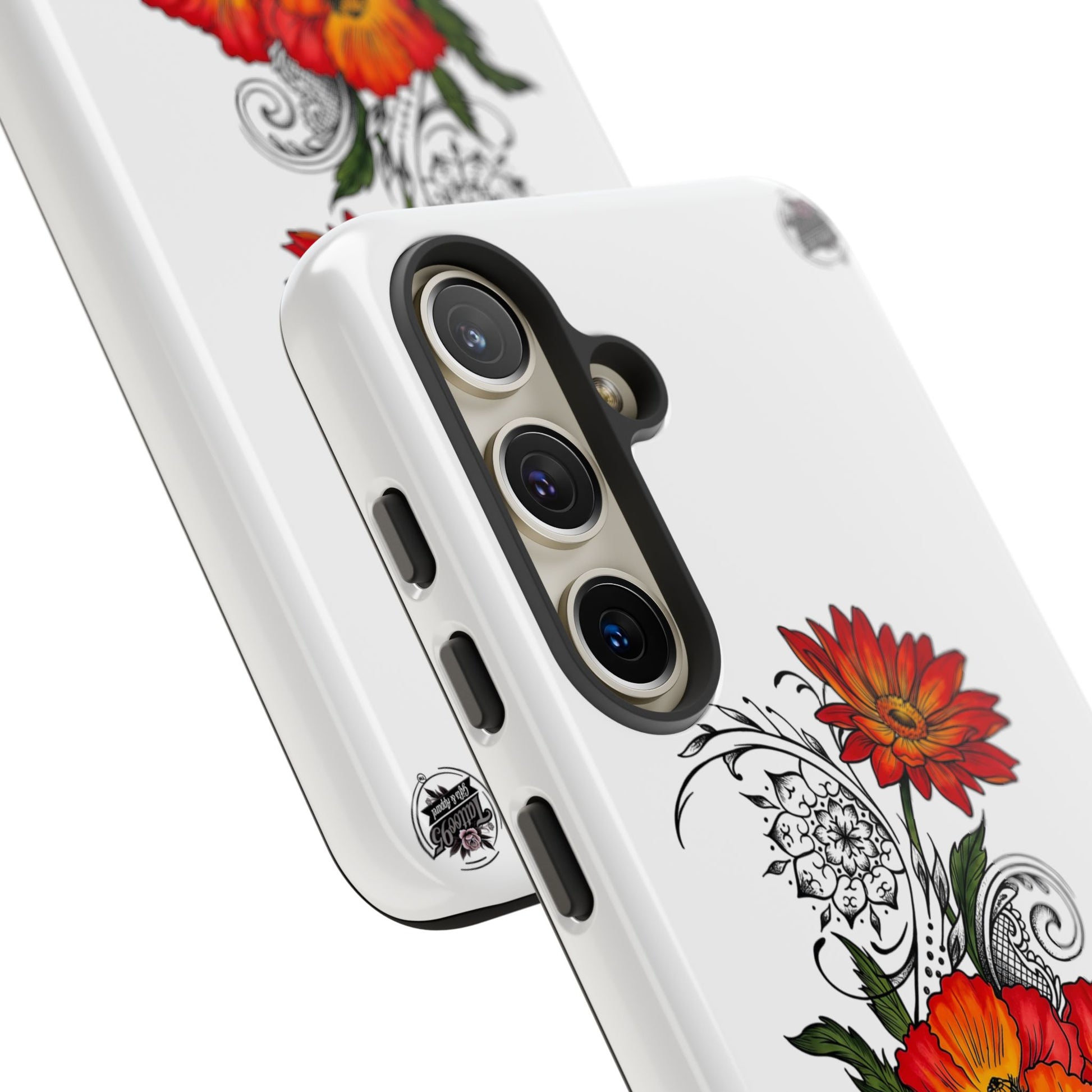A slim, dual-layer protective phone case that brings bold botanical art to everyday life. Bright red-orange poppies bloom across a clean white background, contrasted by intricate black-and-white linework for a handcrafted, tattoo-inspired look. The glossy or matte finish keeps colors vivid while a soft TPU silicone liner cushions against drops. Weather-resistant inks and UV protection help the floral motif stay crisp, whether you carry your phone on a sunny walk or in a busy bag. Thoughtful cutouts keep ports open and it supports wireless charging — practical protection that feels personal and expressive.
