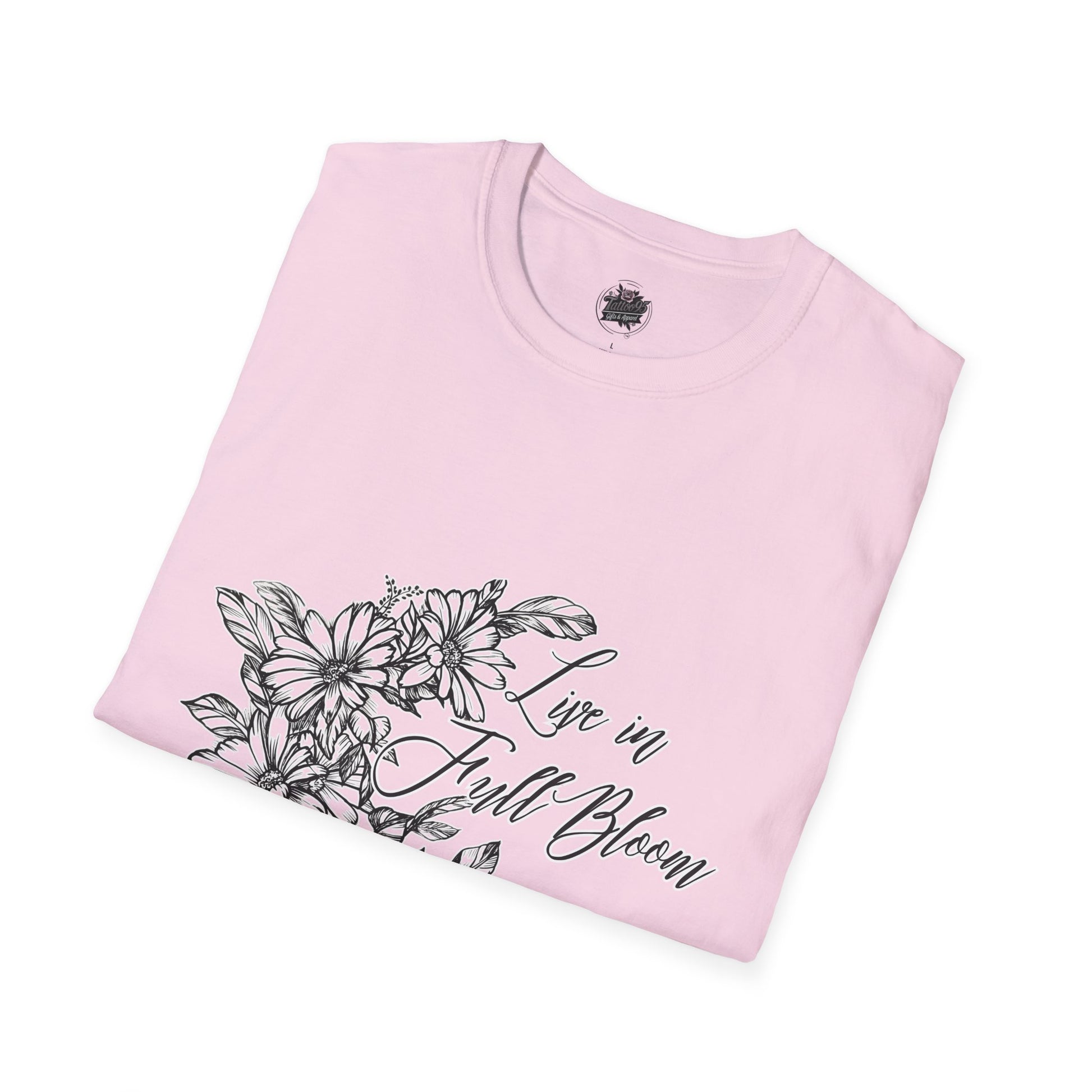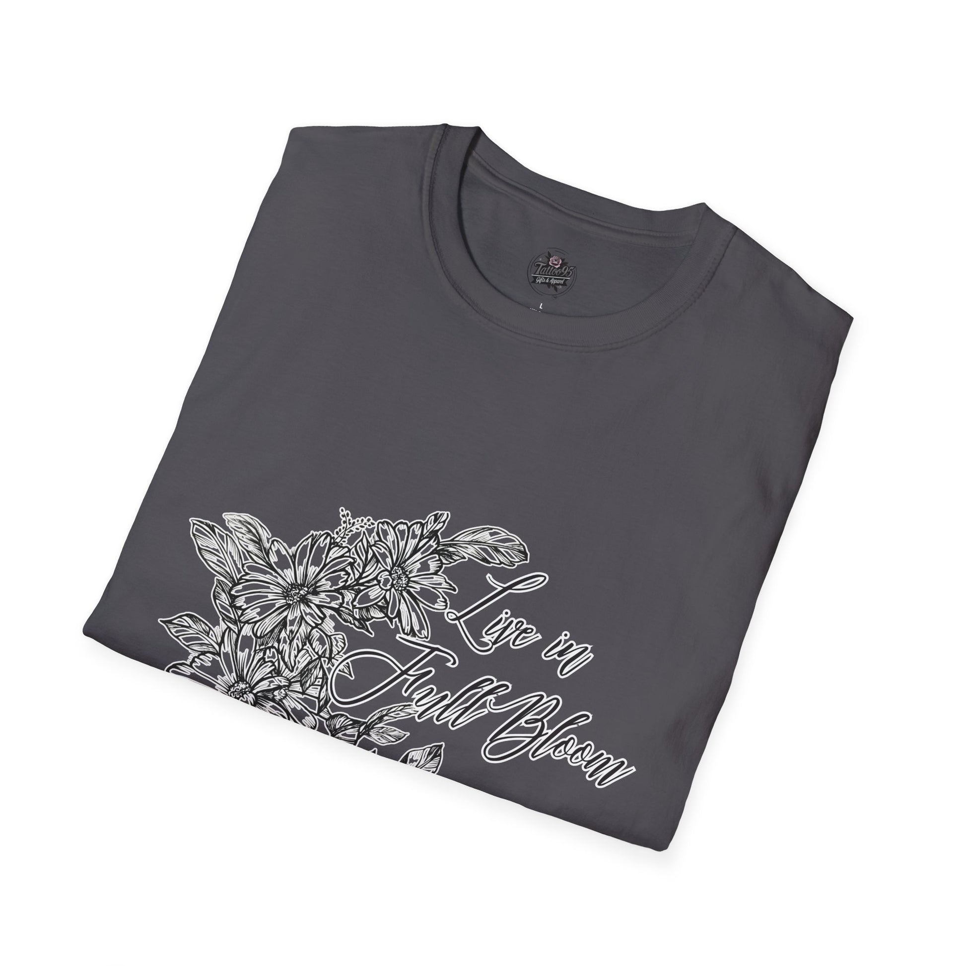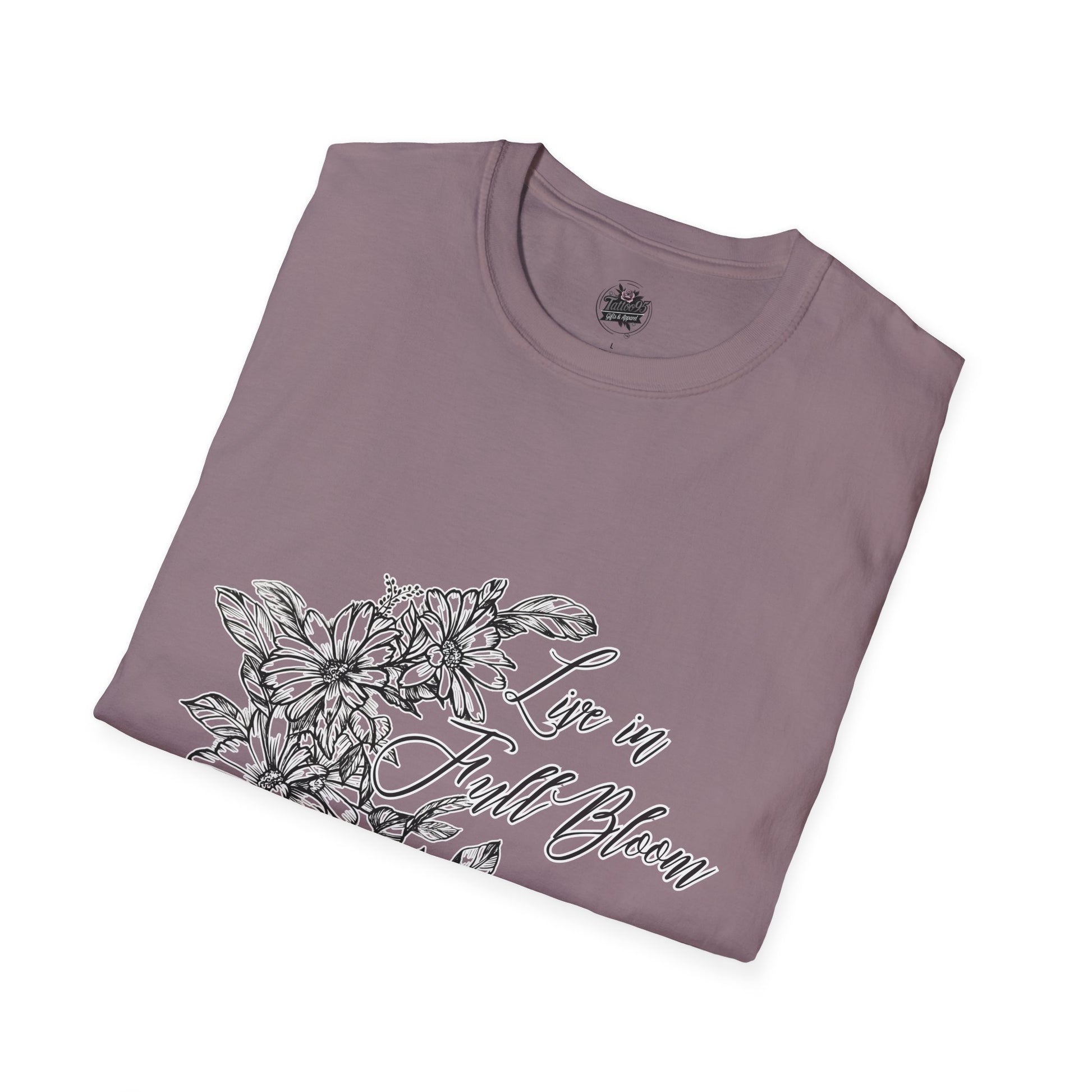 Soft, airy, and quietly uplifting — this tee carries a hand-drawn cluster of blossoms and the script line “Live in Full Bloom.” It sits light on the skin and moves with you: the crew neckline and classic cut keep the silhouette simple so the floral artwork takes center stage. Wear it on slow mornings with coffee, at weekend markets, or layered under a denim jacket for evenings by the river. The feel is gentle and calm, the mood optimistic without shouting — for people who prefer subtle, meaningful style that ages well.