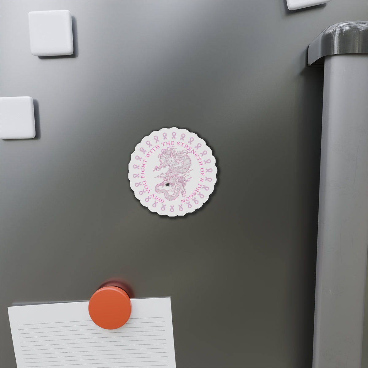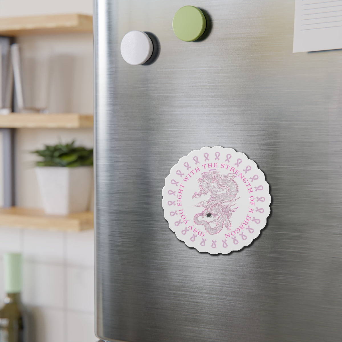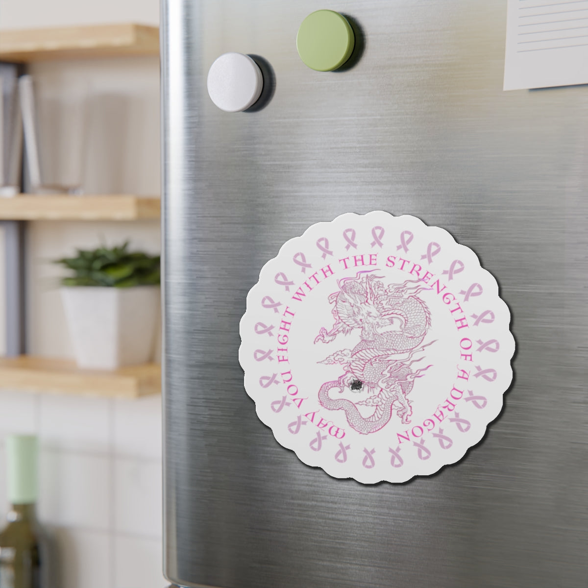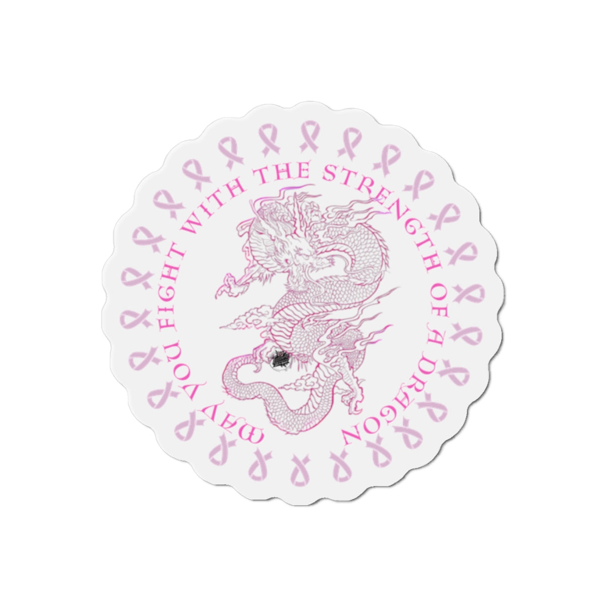 These custom artwork dragon tattoo artwork with the message "May You Fight With The Strength of a Dragon die-cut magnets bring personality to any space. Made with vinyl, they are flexible and durable, perfect for outdoor use. Choose from 5 sizes to fit your decorating needs. Relevant to those supporting breast cancer awareness and looking to add a personal touch to their space. Perfect for Breast Cancer Awareness Month and fundraising events.