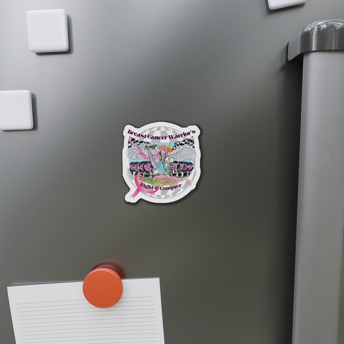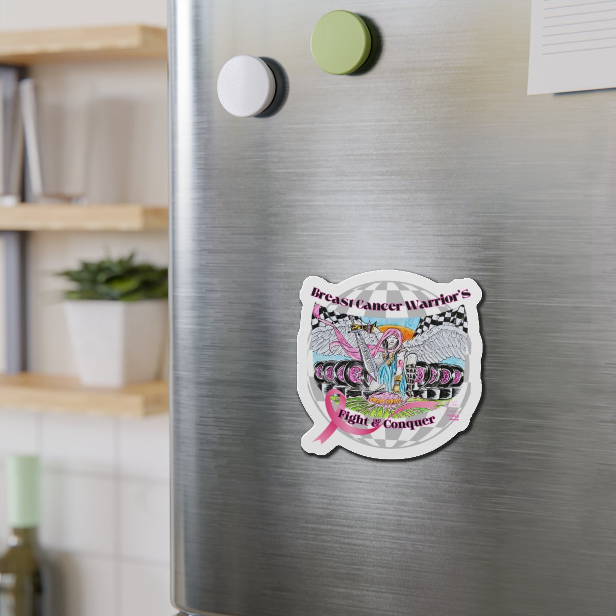 These custom Fight and Conquer Warrior Nikki's Tattoo Studio Collection artwork die-cut magnets bring personality to any space. Made with vinyl, they are flexible and durable, perfect for outdoor use. Choose from 5 sizes to fit your decorating needs. Relevant to those supporting breast cancer awareness and looking to add a personal touch to their space. Perfect for Breast Cancer Awareness Month and fundraising events.