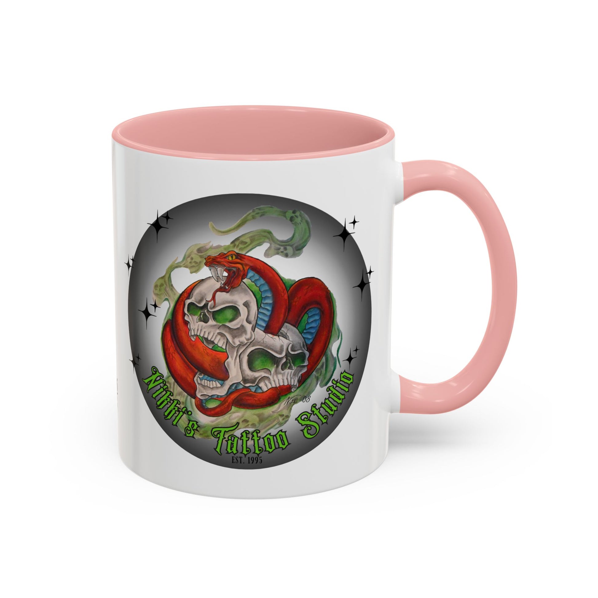 Elevate your coffee or tea ritual with this accented ceramic mug featuring original artwork by Nikki Thompson for Nikki's Tattoo Studio logo. The sleek glossy finish and eye-catching color contrast make this mug a bliss to use and look at. Perfect for coffee lovers and tattoo enthusiasts, this mug is suitable for everyday use or as a thoughtful gift for special occasions.