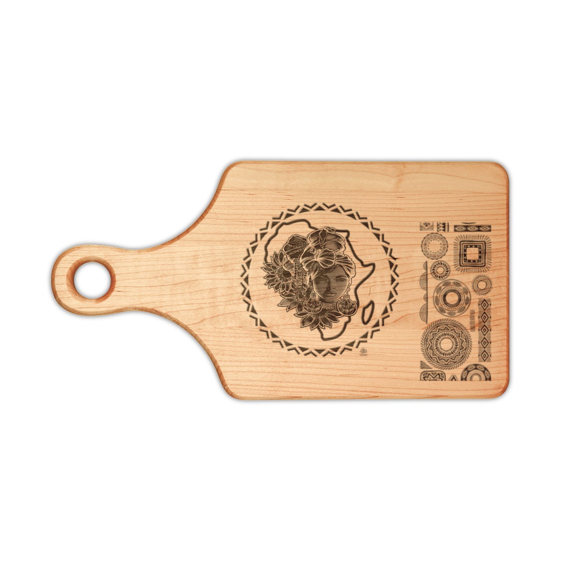 This engraved wooden cutting board brings quiet, tactile beauty to slow kitchen rituals. Warm deep walnut carries a sacred-beauty tattoo motif with African-inspired lines, shaded by the engraving so the image reads like a story folded into the grain. It sits well under a low kitchen light: steady chopping, a loved playlist, and friends circling a simple spread. Use it for meal prep, arranging cheeses, or as a lived-in display piece—the carved juice groove keeps counters clean while the wood ages into its own patina. Made in the USA from premium hardwood, it responds to gentle care; wipe by hand and oil now and then and the design will blend more deeply with the wood’s marks over time. Choose maple for a lighter, rustic warmth or walnut for high-contrast drama that highlights the engraved artwork.