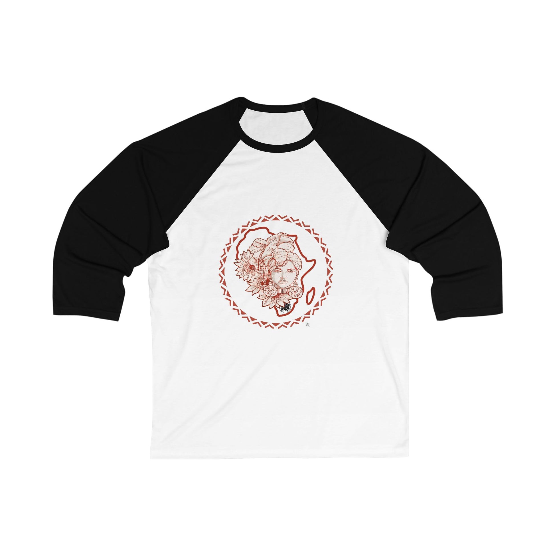 The unisex 3/4 sleeve baseball tee features a unique tattoo design of our Sacred Beauty, Beautiful African lady with headdress adorns this shirt. The modern fit tee is lightweight and comfortable, making it perfect for casual wear. It is ideal for those who love edgy, eye-catching prints and want a versatile piece that can be worn for various occasions.