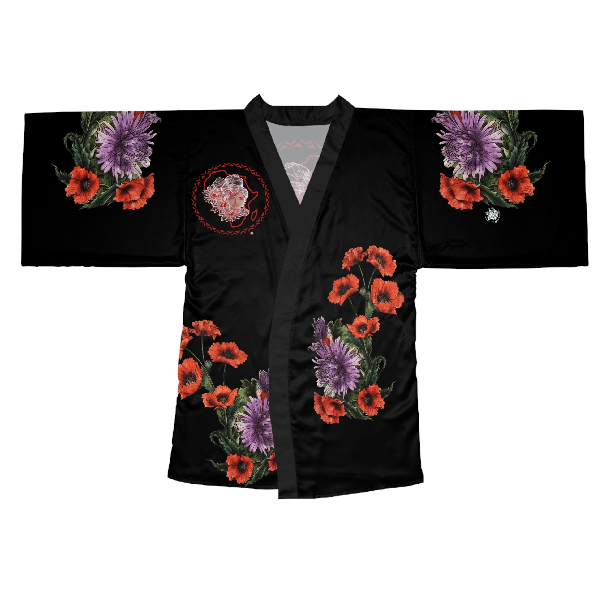 This mid-length kimono robe brings the red poppy purple aster artwork to life with graceful movement and a silky touch. It drapes with a figure-flattering silhouette, long flowing bell sleeves, and a tied waist that lets you shift between relaxed at-home ease and an elegant, layered look for evening occasions. Lightweight and smooth against the skin, the robe moves like the wings that inspired it — calm, luminous, and quietly expressive. Available in black or white, it slips into a Japanese-inspired wardrobe with ease: wear it over simple loungewear for a slow morning, or pair it with fitted pieces and understated jewelry for a night out that still feels intimate and personal. Follow gentle care instructions to keep the print and fabric vibrant and soft.