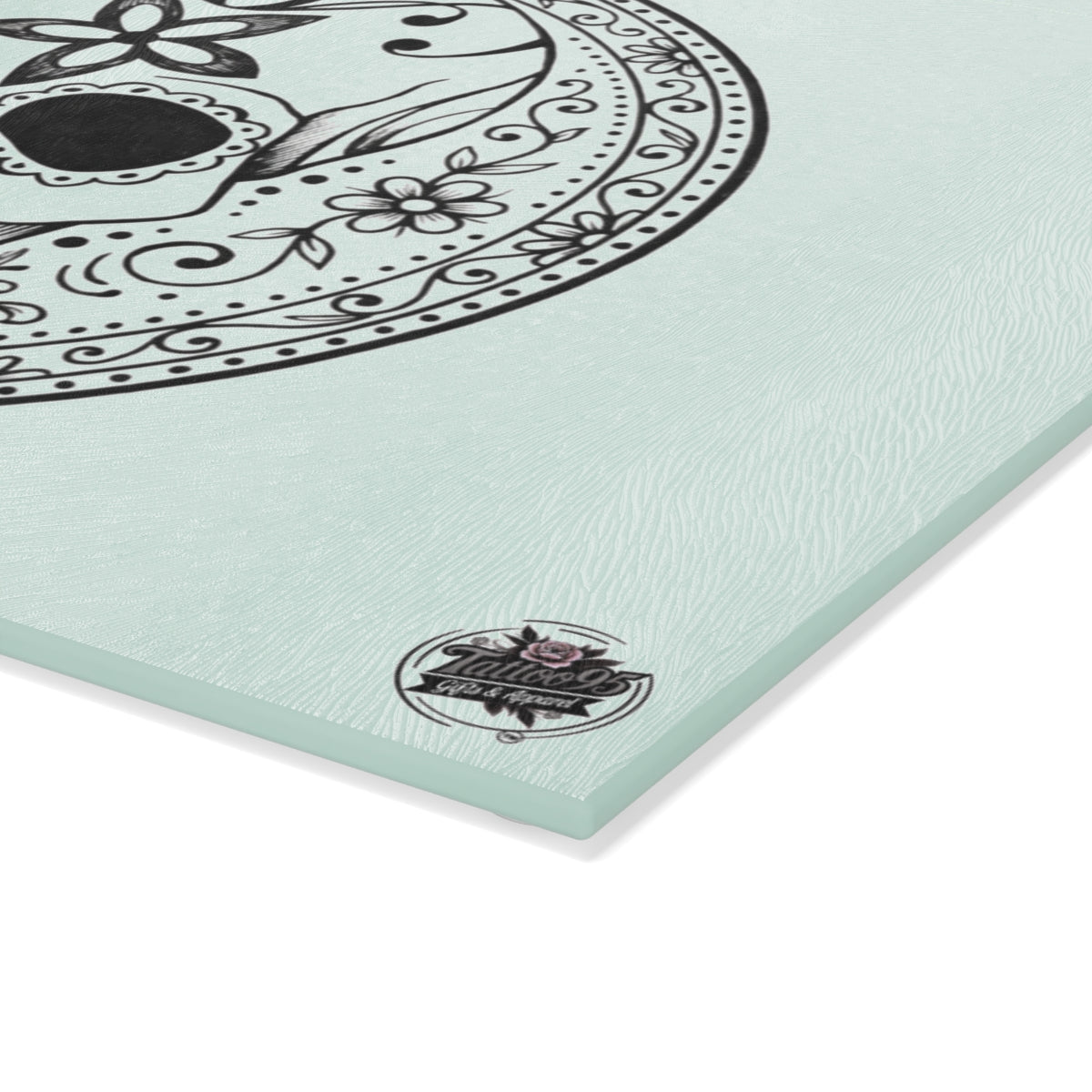 Transform your kitchen prep space with this striking Sugar Skull Glass Cutting Board, where functionality meets artistic flair. Featuring a captivating mint-green backdrop adorned with hand-drawn sugar skull tattoo designs, this tempered glass board brings personality to your culinary routine. The textured glass surface provides a hygienic, easy-to-clean workspace that resists scratching from daily knife use, while four rubber feet keep it securely anchored to your counter. Select the compact 8"×11" size for smaller kitchens or upgrade to the spacious 11"×15" for generous prep areas. Hand wash with mild dish soap to maintain the vibrant colors and keep your artistic kitchen companion looking fresh for years to come.