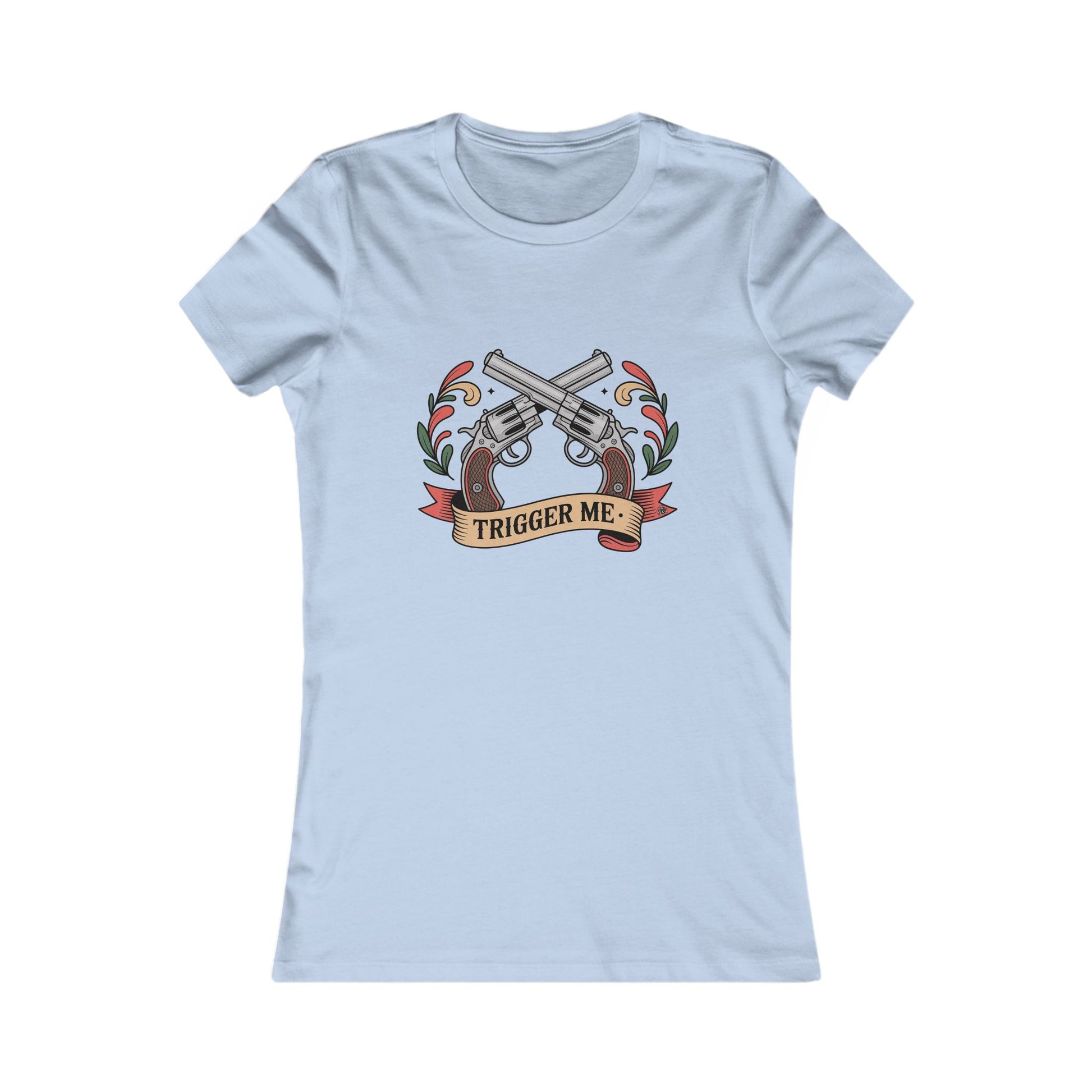 This Trigger Me Woman Tee is designed to feel like a well-loved favorite, offering a stylish and comfortable feminine fit. The ribbed knit collar and shoulder tape provide structural support and prevent stretching. With a slim fit and longer body length, this tee is perfect for women who appreciate both style and comfort. The romantic skulls tattoo artwork brings the romance! Ideal for everyday wear or as a thoughtful gift for women who appreciate beauty and comfort. Perfect for casual outings, work-from-home days, and gifting occasions such as birthdays or holidays.