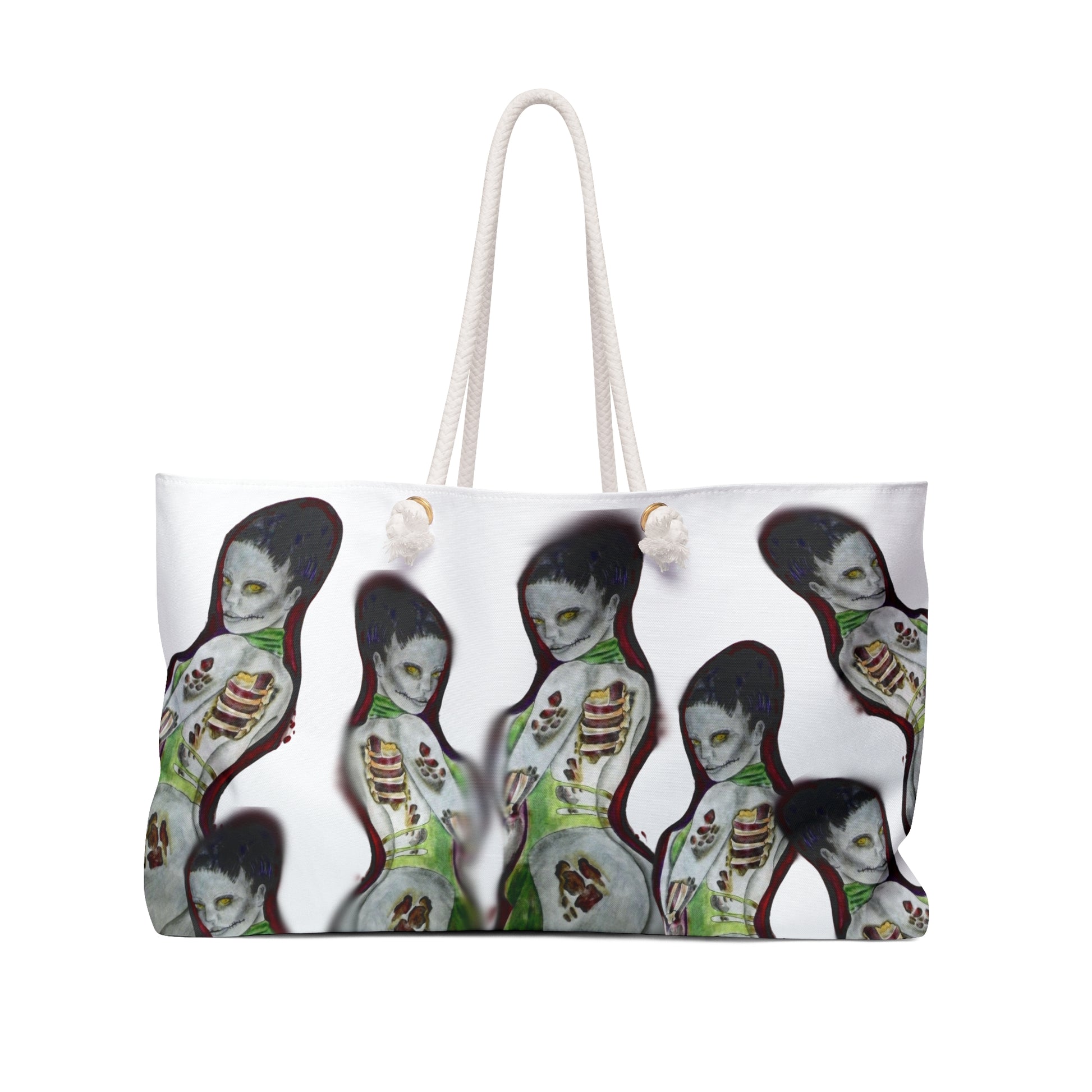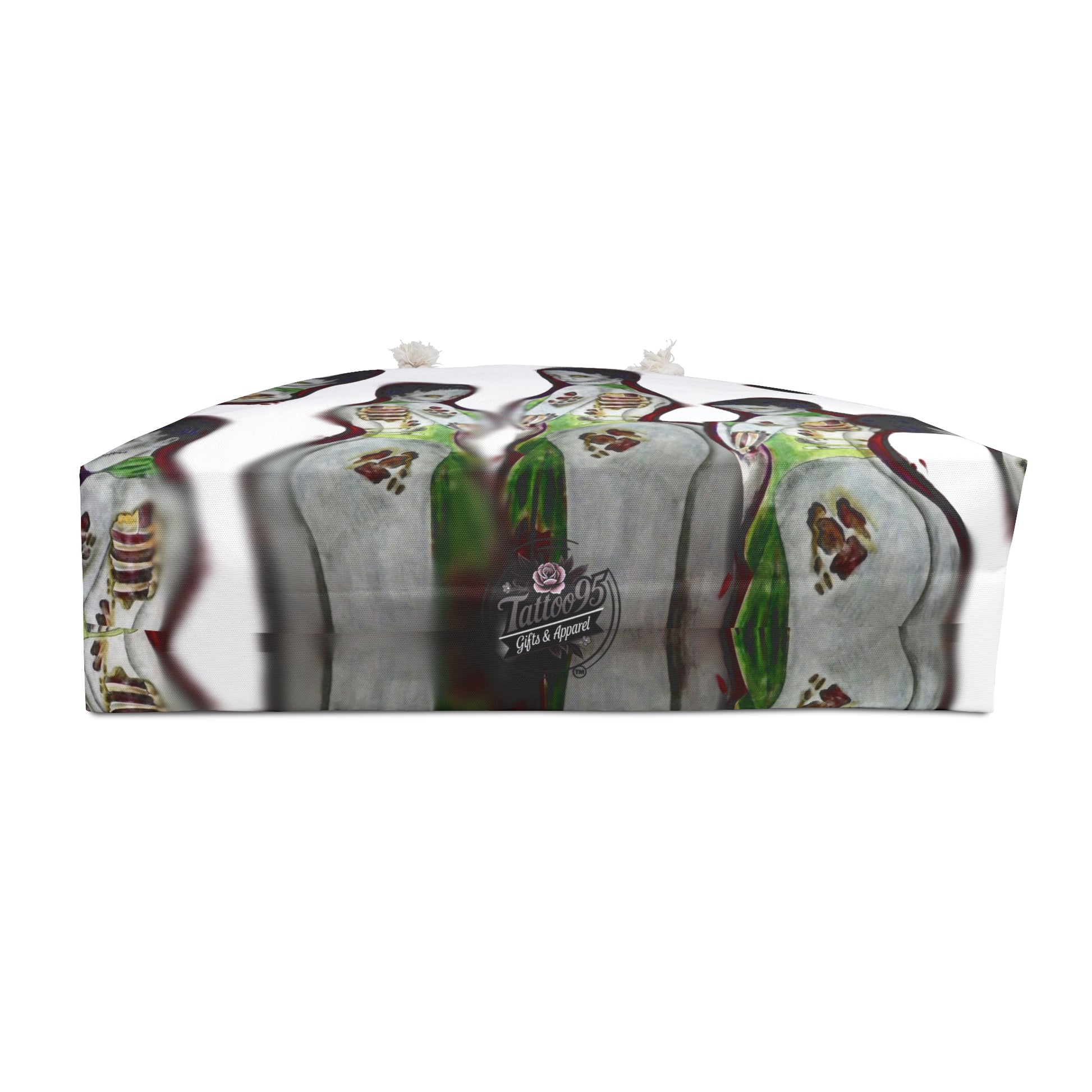 This oversized weekender bag carries a confident, slightly spooky vibe with Deadrah the Zombie Lady tattoo art across its cream exterior. It’s roomy and open-mouthed, ready for a sandy towel and sunscreen or a stack of sketchbooks and a camera. Thick cotton rope handles threaded through gold-toned grommets feel substantial in hand, while the T-bottom keeps the base steady when you set it down. Inside, a soft cream sheeting lining cushions belongings and keeps the interior neat. Built to travel and last, the bag moves with you from beach boardwalks to late-night markets, bringing a touch of playful macabre wherever it goes.